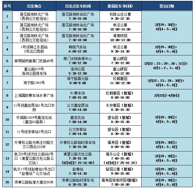 为了方便市民在错峰出行扫墓,与往年相比,扫墓班线的设置提前一个周末启动。3月22日起,当地开通清明定点扫墓班车15辆,共投入运营车辆307辆,其中免费乘坐8辆短驳车,覆盖当地嘉定、青浦、金山、崇明十余个墓地。