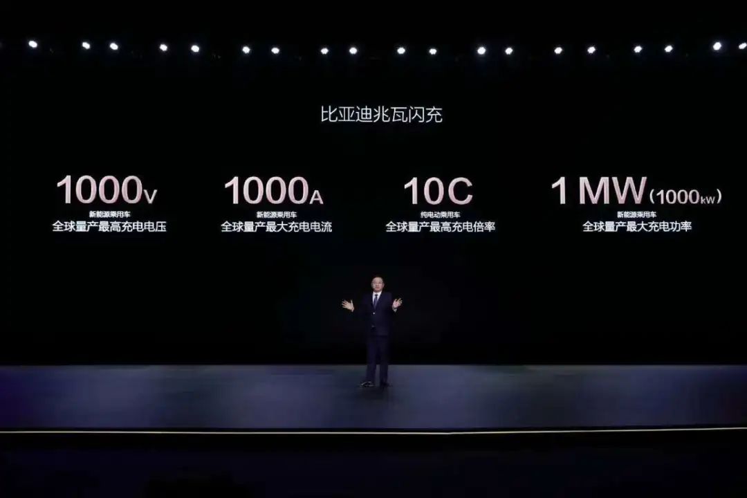 而且本周,一场名为“兆瓦闪充,油电同速”的新闻发布会慢慢拉开帷幕,比亚迪掌舵人王传福宣布,配备非常E平台的比亚迪车型,将支持1000V电压,1000A电流,实现1兆瓦(1000kW)充电功率,以及10C充电倍率。