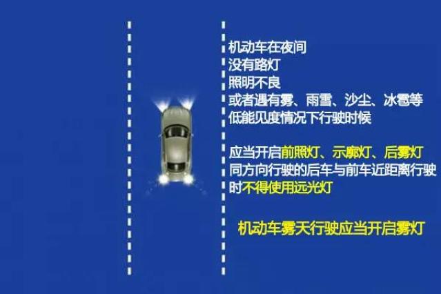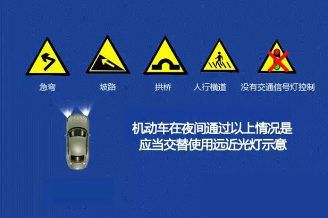 ▶在一些特殊情况下,远近光灯可以交替显示。比如晚上超车时,提前打开左转向灯,交替使用远近光灯或喇叭;夜间通过急弯、斜坡、拱桥、人行道或无交通指示灯控制的路口时,应交替使用远近光灯显示。