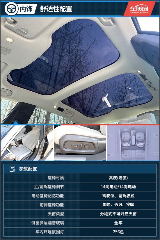 在舒适性配置方面,评估车配置不能分段打开天窗,面积大,采用第三代软电致变色技术,总能量通过率最低。 12%,能智能感应环境光,主动调节透光,时刻保持最舒适的状态。座椅采用皮革材质,支持多向电动调节,填充物柔软。此外,前排座椅具有加热、通风和按摩功能,乘坐舒适性值得肯定。另外,评估车还配备了整车侧窗多层隔音玻璃,保证了驾驶时的安静。