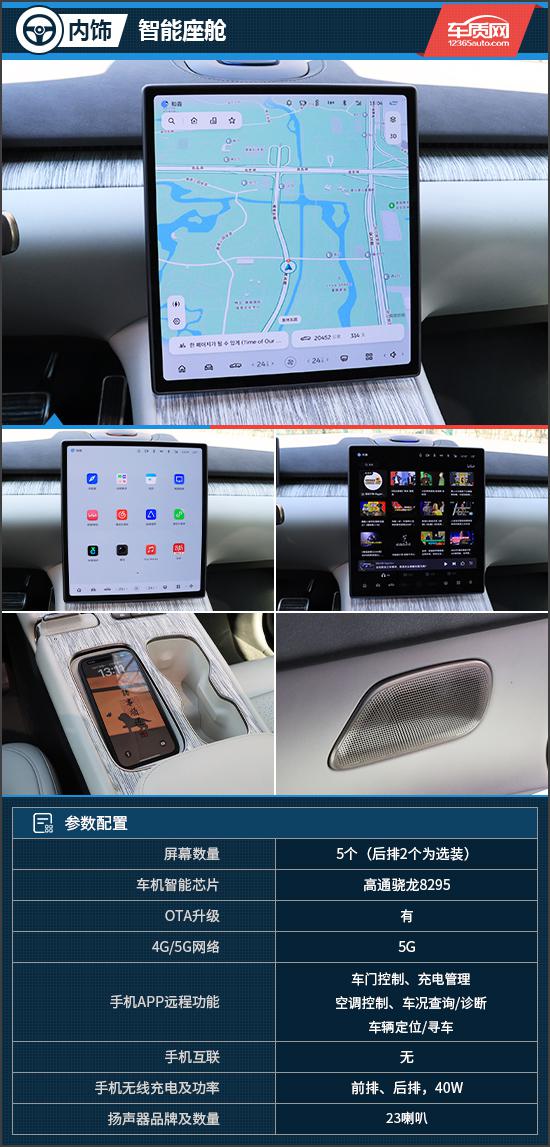 车机是蔚来 ET7 亮点之一,内置高通骁龙 8295 该芯片具有优异的响应速度,并且还支持全舱免唤起、多人自由说、无限指令等功能。最值得一提的是,借助大模型能力,汽车还可以帮助你记忆备忘录、专业问答、商务迎宾等。,就像一个无所不能的个人助手。在中控台上方设置了一个手机槽,拿放手机非常方便,而且有一个手机槽, 40W 无线充电功能。评估车也配备了 23 一个喇叭,并引入了杜比全景声技术,具有出色的音质。