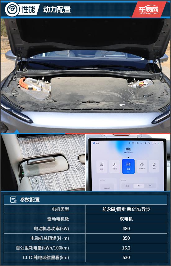 评估车配备了由前后双电机组成的动力系统,电机总功率 总扭距达到480kW 850N · m。与电池电量相匹配 75kWh,CLTC 纯电续航里程为 530km。