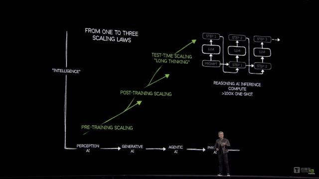 黄仁勋认为,从两年前开始。 ChatGPT 到如今 DeepSeek 引起推理能力,Scaling Law(规模法则)并没有消失,而是从一个变成了三个——预训练拓展,代理人工智能。(Agentic AI)后训练拓展阶段,今天的计算能力需求已经高于去年估计的规模。 100 倍。