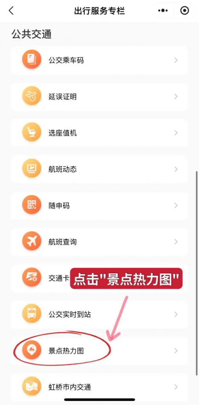 在“旅游服务栏”页面向下滑动,在“公共交通”板块倒数第二排,点击“景区热图”网页跳转即可。