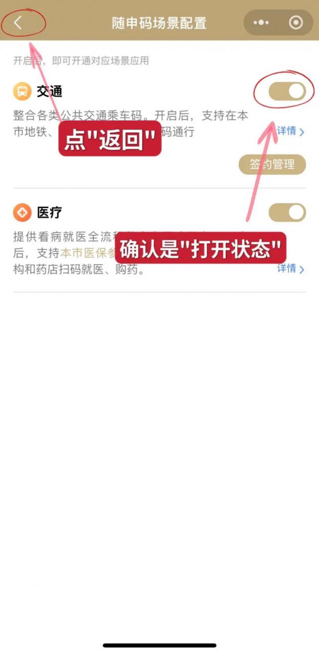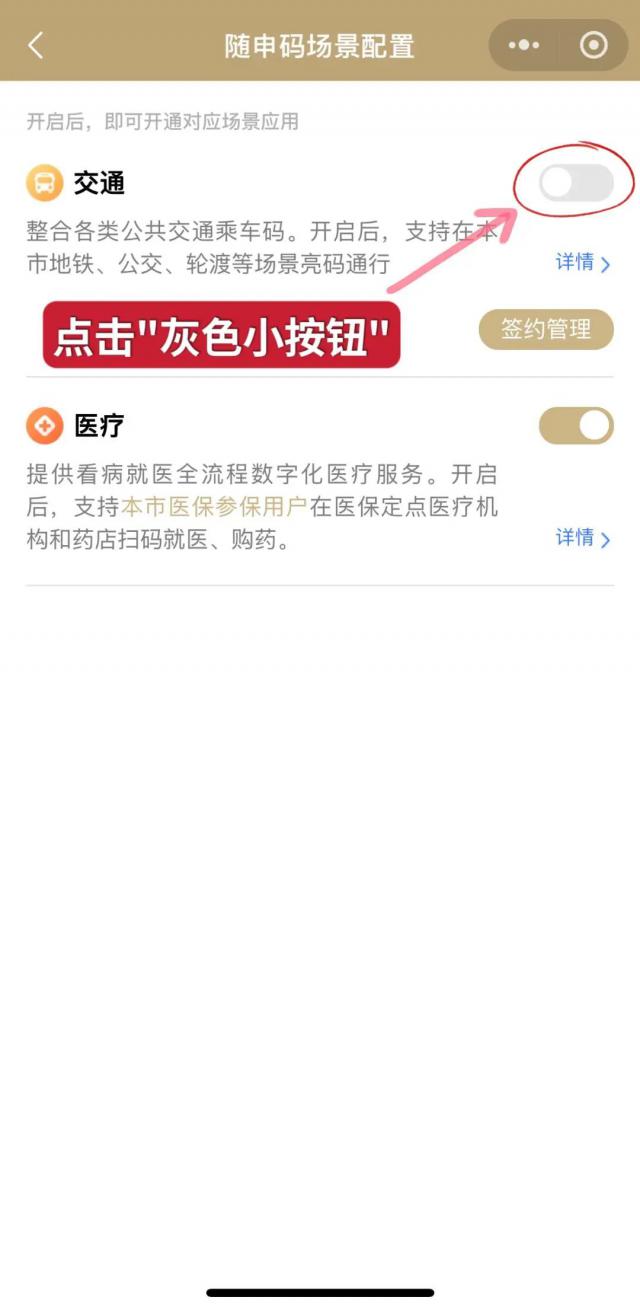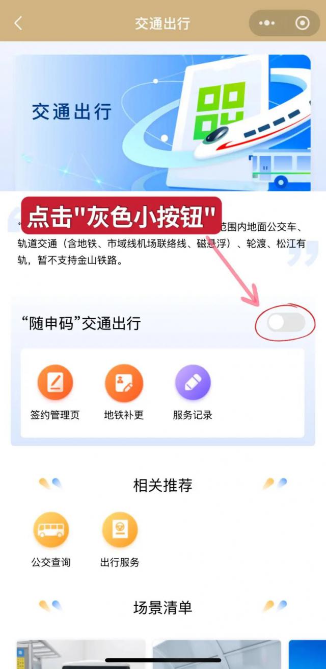 打开后,配备“随申码场景”“打开”交通”右侧的小按钮,然后返回您的“随申码”页面,即可刷码乘坐交通工具。