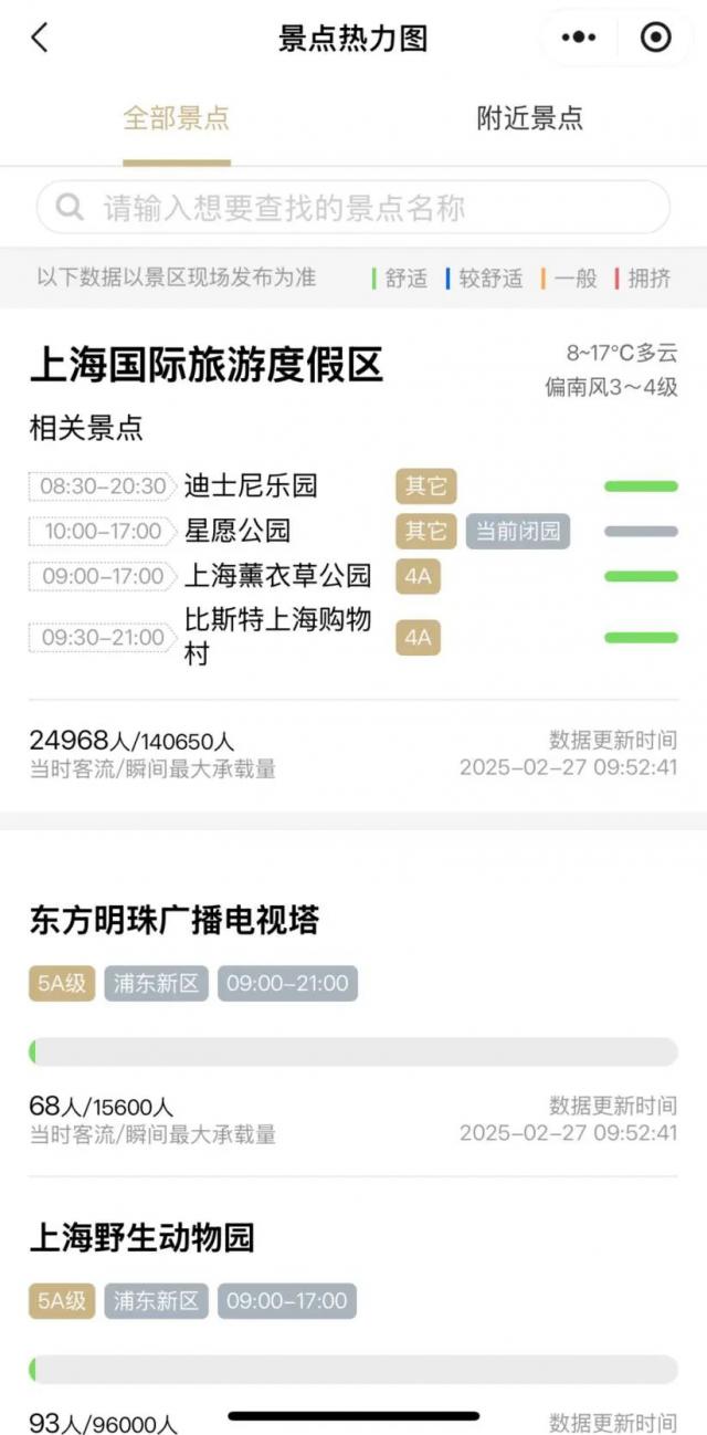 在“景区热图”板块中,我们可以看到上海所有景点及其周边景点的人流情况和营业时间。