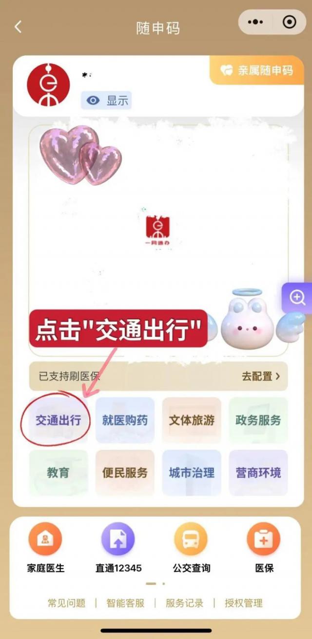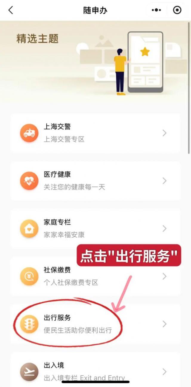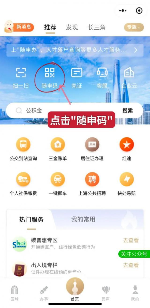 开启"跟随市民云申办"(APP、小程序,支付宝小程序),“首页”找到“随申码”点击跳转,然后在随申码页面,点击下面的“交通出行”跳转。