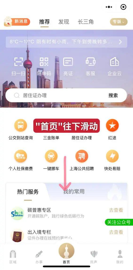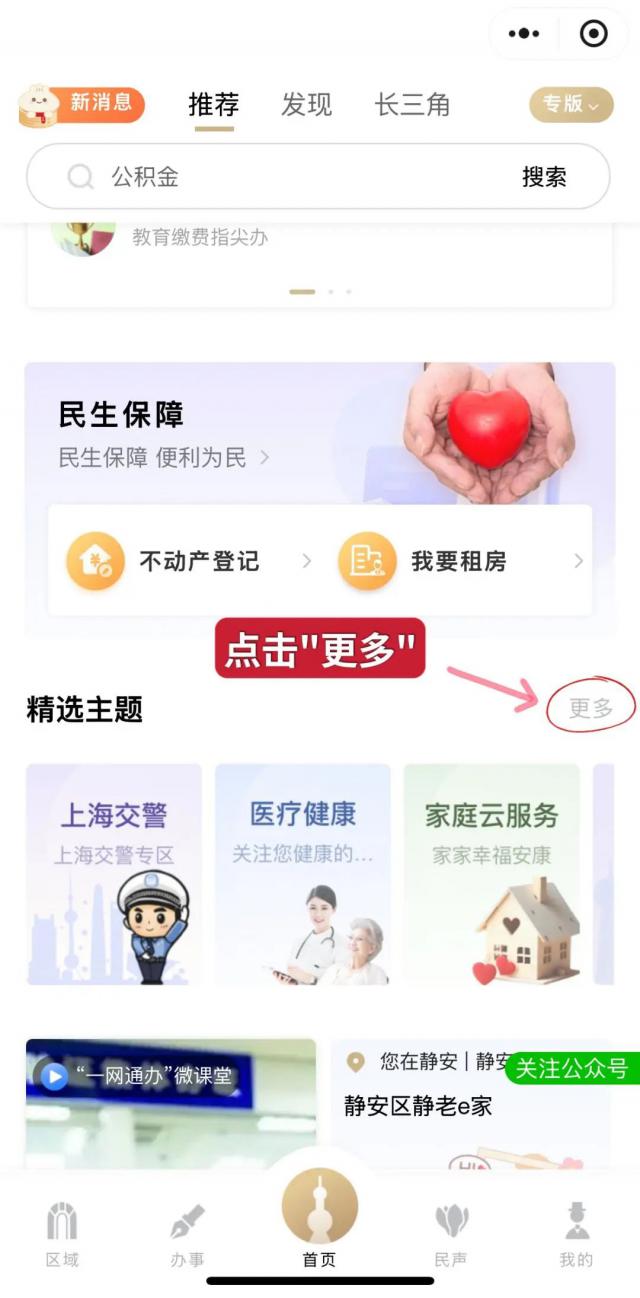 开启"跟随市民云申办"(APP、小程序,支付宝小程序),“首页”向下滑动,找到“首选主题-更多”点击跳转。
