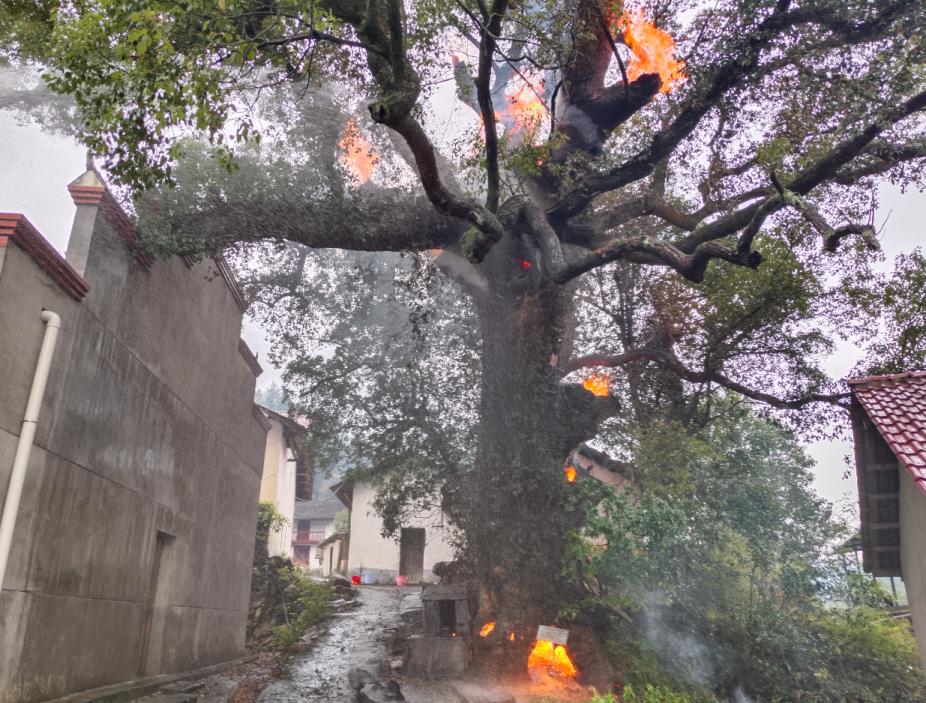 一棵400年的樟树着火了。