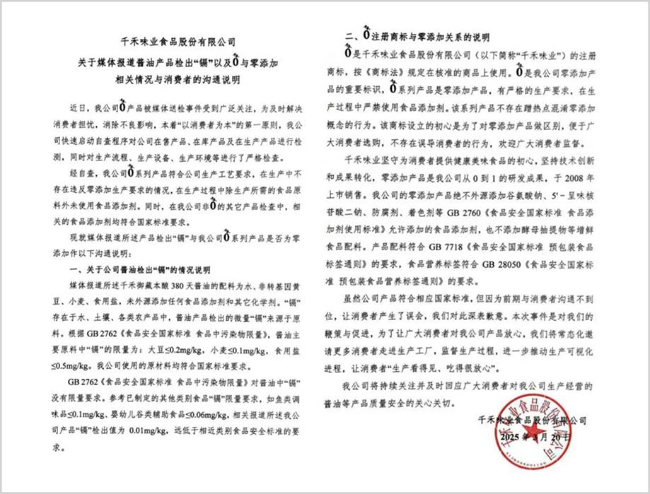 最近,千禾味业因其“千禾0”系列生抽被发现少量重金属镉,陷入舆论漩涡。