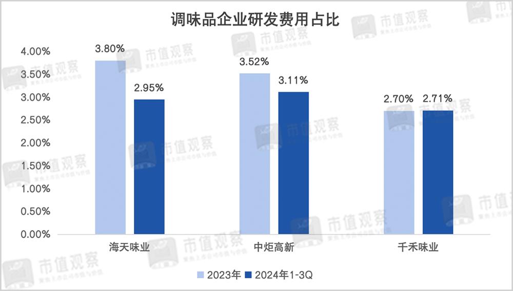 可以体现在R&D支出上,千和味业不如同行。根据《市值观察》的计算,千和味业的R&D费用占比长期徘徊在2.7%左右,低于海天和中国火炬的3%。 标准,在其申请的200多项专利中,大部分集中在外观设计、设备、器具等领域,只有极少数涉及发酵技术等关键技术。