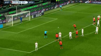 B 费用随后主罚角球,C 罗高高跃起争夺,导致丹麦后卫安诺森乌龙,首次为葡萄牙队记录。
