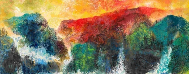 从某种程度上来说,谢天成的大写意山水艺术之路是1982年从刘海粟九上黄山正式启航的。他的艺术探索之路也是中西融合之路,一直跟随刘海粟的发展,尤其是在泼墨和泼彩方法上。然后他走出了一条中国当代山水画突破的新路,我称之为“彩色墨象”。