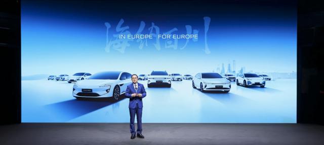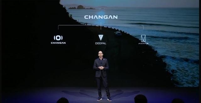 长安汽车董事长朱华荣穿着深蓝色西装,英语流利。在德国举行的长安汽车发布会上,他分享了欧洲品牌发展战略。