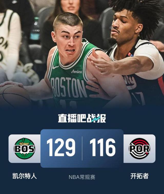 比赛开始时,普理查德继续被吹犯规。 3 犯下结局,双方外线继续对战,凯尔特人更胜一筹,塔图姆连续送助攻领队第一节领先。 10 分,次节开拓者使力持续反击一波浪潮。 12-0 霍福德连续中远投止血,绿军回应直接追平比分, 9-0 保持领先优势,随后凯尔特人继续在外线发射半场领先。 13 分。三是塔图姆开始发力,每一节内突外投都轰下来。 18 分数,凯尔特人曾经拉开近距离。 20 领先,但顽强的开拓者仍然追上差距。 12 分,最后一节双方继续进攻,外线来来往往,但凯尔特人始终保持着十几分领先,最终凯尔特人 129-116 击败开拓者,获得 5 同时结束对手的连胜 4 连赢。