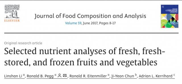 [ 2 ] Li, L., Pegg, R. B., Eitenmiller, R. R., Chun, J. Y., & Kerrihard, A. L. ( 2017 ) . Selected nutrient analyses of fresh, fresh-stored, and frozen fruits and vegetables. Journal of Food Composition and Analysis, 59, 8-17.