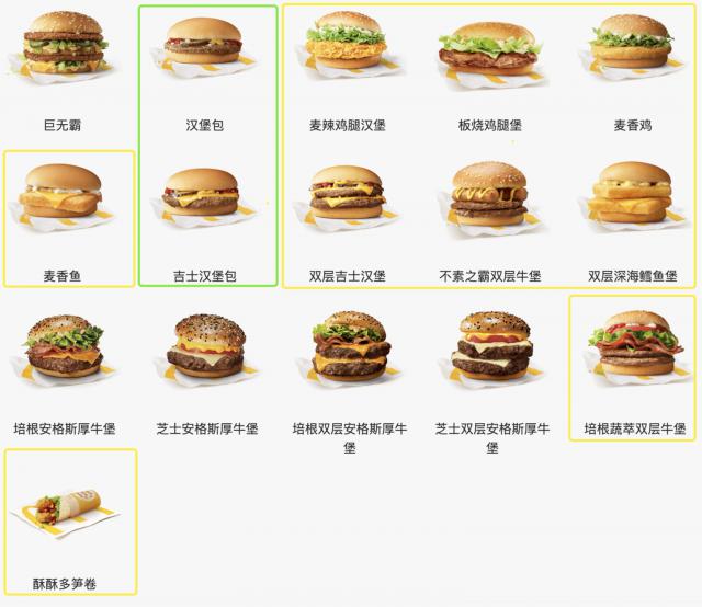 基于肯德基网站上的公开信息, 16 在销售的汉堡和卷子里——