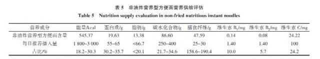 一项发表在《食品研发》上的研究表明,碳水化合物、蛋白质和脂肪在非油炸营养方便面中的能量占比分别为 59.2%、15.2% 和 与蛋白质相符的25.6% - 脂肪 - 碳水化合物能量平衡原则,并提供多种维他命,符合《中国居民膳食营养素参照摄取指导》的指导。 [ 3 ] 。