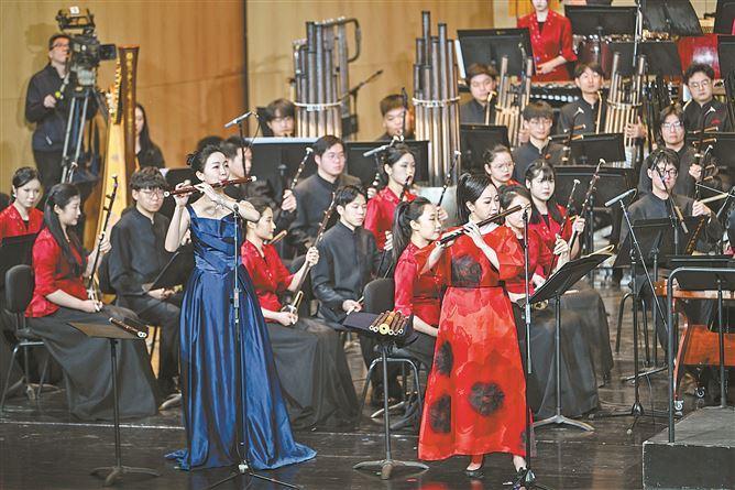双竹笛协奏曲《爱与冷漠的邂逅》是一部呈现“潮”与“年轻态”的当代民乐作品,融入了南音元素。(厦门日报记者 林铭鸿 摄)