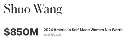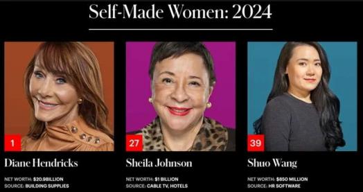 在福布斯发布的《2024年美国白手起家女富豪榜》中,王硕与全球巨星麦当娜并列第39位,财富8.5亿美元。她的故事就像从一个小镇到一个国际舞台的精彩变化,充满了丰富的东北氛围和全球商业智慧。