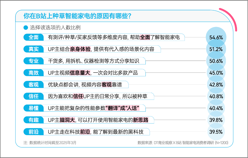 根据哔哩哔哩的内容数据,2024年智能家居和智能家电新增稿件数量同比增长270%和386%,新增UP主数量同比增长150%和240%。此外,DT商业观察的一项数据调查显示,全面(54.6%)是哔哩哔哩用户种草智能家电的前三大原因。、真实性(51.2%)和专业(50.6%)。