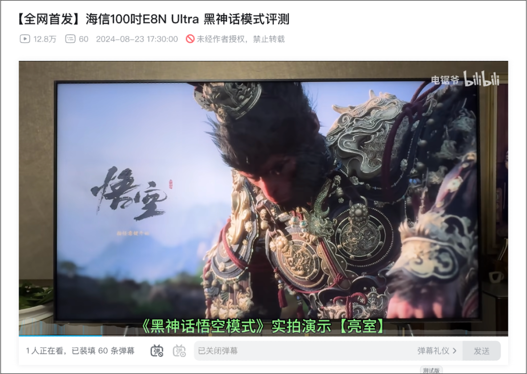 此前,海信和科技区UP主“大声Loud” 合作,从专业角度普及“高参数不一定等于好画质”,进而突出海信U8N Pro基于画质芯片带来的产品优势。然而,在主机游戏《黑色神话:悟空》成为一个突出的热点后,UP主持人“大声Loud”专门制作了一个视频,介绍了《黑色神话:悟空》官方定制电视海信E8N。 Ultra。