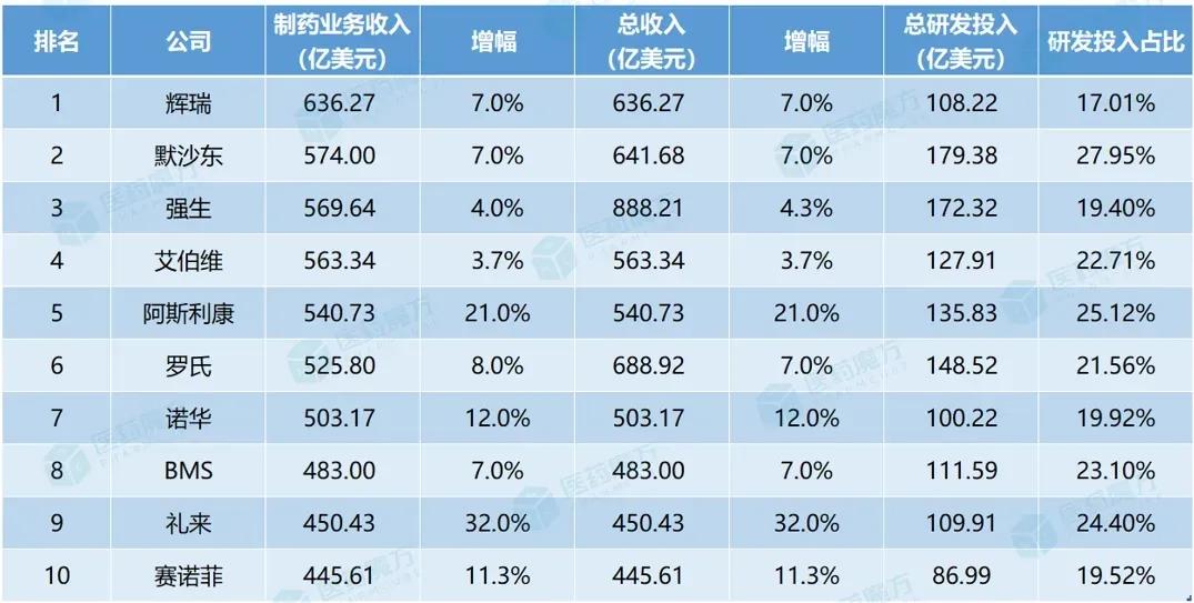 根据医药业务收入排名,辉瑞、默沙东、强生、艾伯维、阿斯利康、罗氏、诺华、诺华、BMS、礼来,赛诺菲。