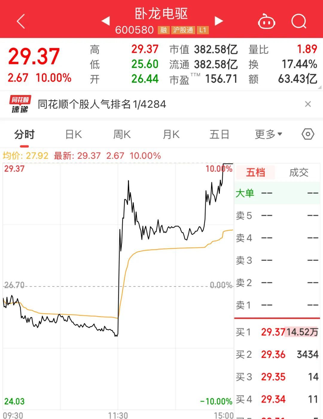 同花顺热股排名第一 卧龙电驱(600580)下午直线拉升,尾盘日线涨停,全天成交额63.43亿元,成交额位居a股市场第一。。根据“卧龙电驱”官微,公司近日与上海智源创业科技有限公司签订战略投资合同,正式成为该机器人创新企业的战略股东。