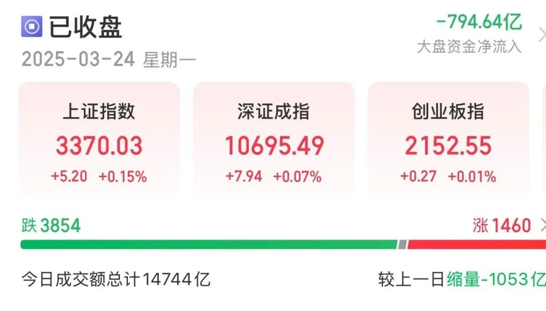 接近收盘,三大指数回暖,14:49,上证综指率先翻红,随后,深交所指数和创业板指数均小幅上涨。截至收盘,上证指数上涨0.15%,深交所指数上涨0.07%,创业板指数上涨0.01%,全市场全天成交额1.47万亿元,较前一交易日缩水1053亿元。