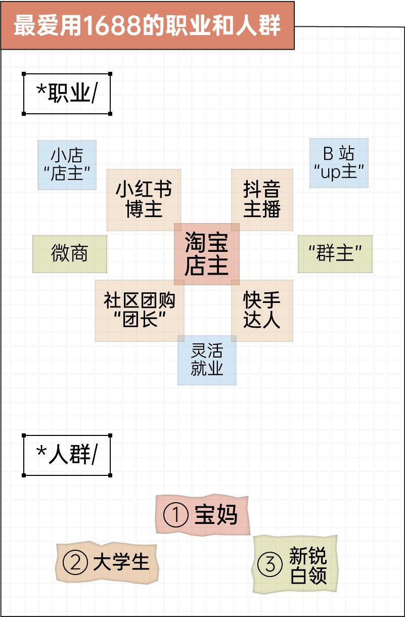 除众所周知的淘宝店主、抖音主播、快手达人、社区团购“团长”外,、微商,各种“群主”、小店“店主”、电商从业者小红书博主,宝妈、大学生、前沿白领、外卖骑手、网络汽车司机等灵活就业人员试图做副业和轻创业,也是1688年的新客户。