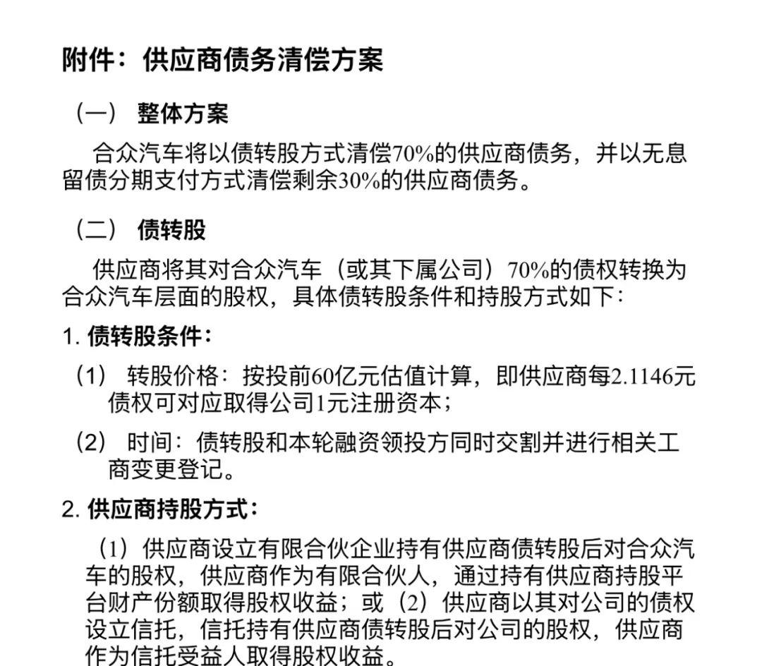 针对众多不同规模的供应商,哪吒汽车也提供了多种“化债”方案,根据轩辕商业评论,目前主流的方案之一是,供应商70%的债务将转化为哪吒汽车总公司合众汽车的股份,剩下的30%的债务将以现金分期偿还为免息债务。