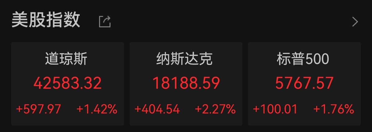 美股三大指数周一集体上涨。道琼斯指数在收盘时上涨1.42%,报42583.32点;纳斯达克指数上涨2.27%,报18188.59点;标准普尔500指数上涨100.01点,上涨1.76%,上涨5767.57点。