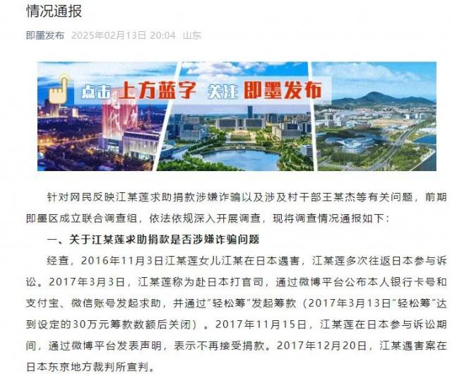 青岛即墨区上个月发布了一份关于“江歌母亲诈骗”问题的调查报告。