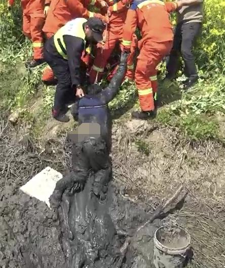 消防队员赶到现场后,发现当事人被困在一条偏僻的沟里。因为沟里空间宽,污泥厚,动弹不得。“当时她半个身体都被困在泥里,污泥质地柔软,没有工具让她借。”赶到现场的网站政治指导员倪正茂回忆说,当时阳光越来越强,农妇的情况相当危急。