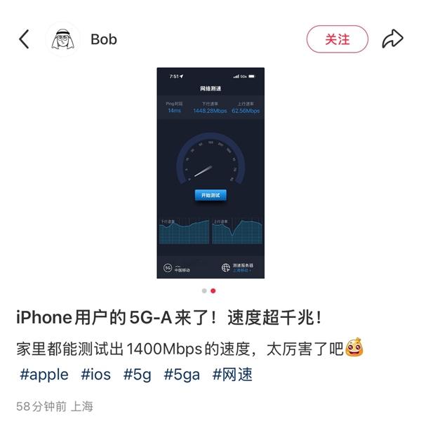 激活了 5G-A 的 iPhone 实测网速可以达到 1400Mbps的速度远远超过传统 5G。