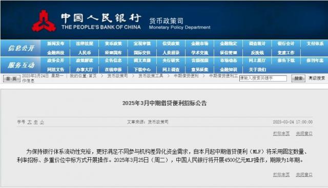 3 月 24 日前,央行宣布,为了保持银行系统充足的流动性,更好地满足不同参与机构的多元化融资需求,从本月开始,中期借贷便利(MLF)将采用固定数量、利率招标、多价中标等方式进行操作。央行 3 月 25 日将开展 4500 亿元 MLF 操作,期限为 1 年限。