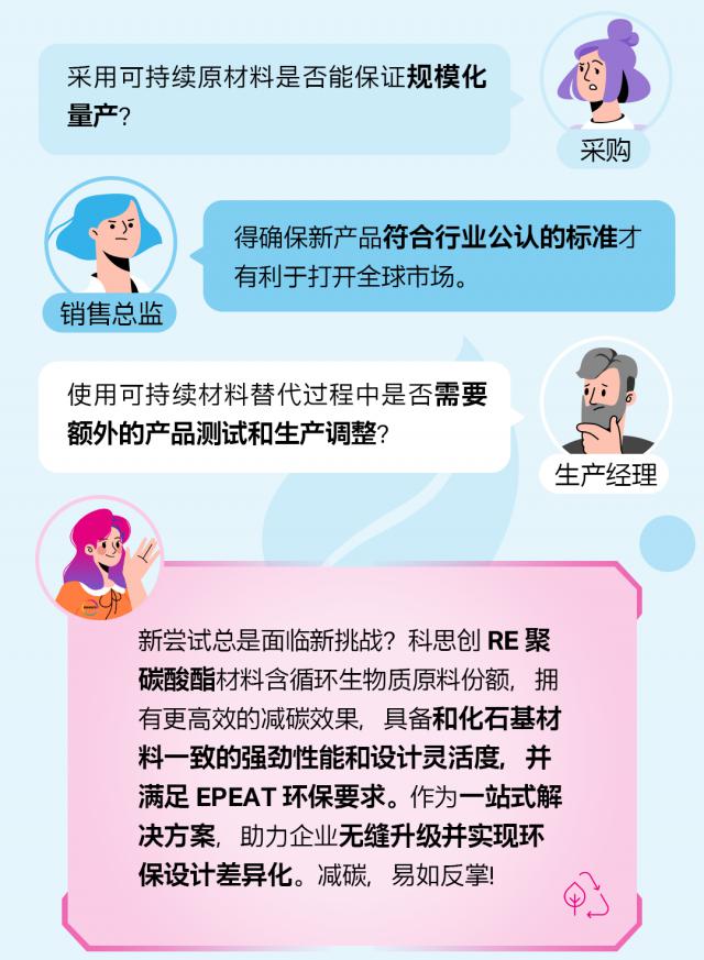 选择合适的低碳材料并不容易,很多企业都表达了一些担忧:更换材料时是否需要承担生产线改造、工艺调整等隐性成本?怎样通过复杂的检验认证过程,保证低碳材料的合规性?用低碳材料代替会影响产品特性吗?针对这些担忧,世界领先的材料供应商科思创基于对全球消费电子市场的深入研究和丰富的实践经验,对消费电子行业的低碳转型进行了专业的科普和解读,为企业提供了“成本友好”、“减碳高效”的“平滑”路径。