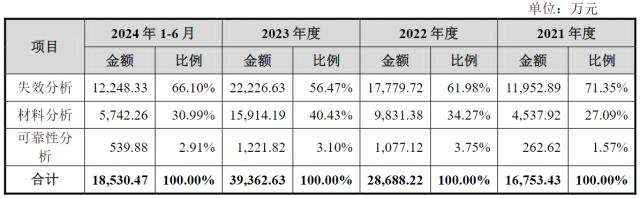 从收入结构来看,胜科纳米的销售收入主要来自失效分析和材料分析业务,技术难度较大,可靠性分析处于发展初期。根据 QY Research 数据估算、失效分析及材料分析市场总规模约为 41.47 亿元,公司 2023 在失效分析和材料分析领域,年度国内收入总额达到 3.26 国内市场份额约为亿元, 7.86%。