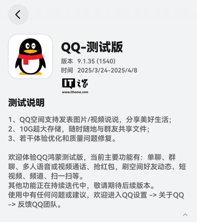 IT 世家 3 月 25 每日消息,除微信外,QQ 鸿蒙版 App 昨天也在华为的应用市场(App Gallery)开启了 9.1.35(1540)升级测试版本,测试时间为 2025/3/24- 2025/4/8。