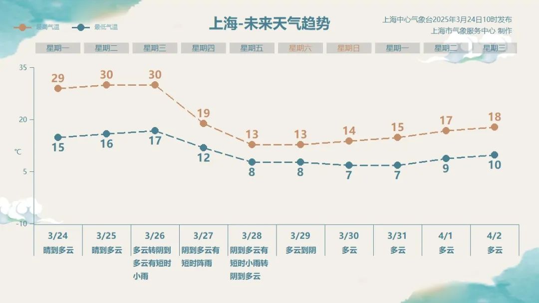 今天和明天的温度都比较低,估计最高温度会超过30℃,3月下旬这么高的温度很少见。经过这波强烈的回暖,周四一股强烈的冷空气随着风雨而来,将温度纠正到正常状态。本周后期,当地气温降至7~14℃。气温起伏不定。请及时关注最新的天气预报信息,及时增减衣物,预防心血管疾病,谨防感冒。