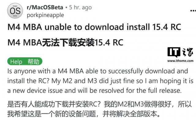 部分 M4 Mac 用户反馈不能升级为苹果 macOS 15.4 RC