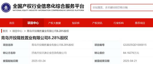 乐居财经 王敏 3 月 24 日,根据全国产权交易中心,青岛开投隆胜置业有限公司 8.28% 股份挂牌转让,转让底价为 84.18 一万元,出让方为济南开投沃源企业咨询有限公司,披露结束日期为 2025-04-21。
