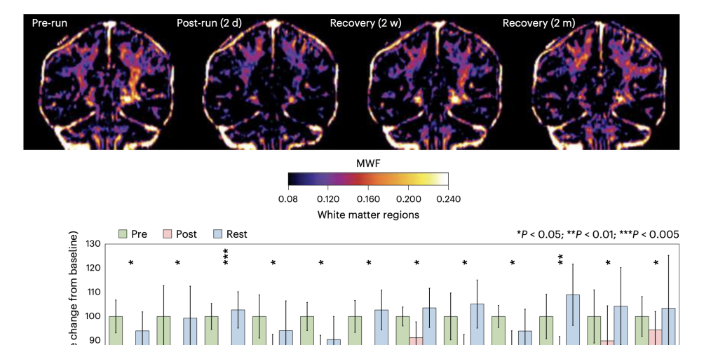 对髓鞘水分进行测量(MWF)——髓鞘含量的替代指标,研究人员发现,马拉松比赛结束后,12个白质区域的髓鞘含量在跑步者大脑的50个白质区域中呈现一致性和明显的区域性下降。两周后,大脑区域的髓鞘含量明显增加,但仍未恢复赛前水平;两个月后,它完全恢复到赛前状态。
