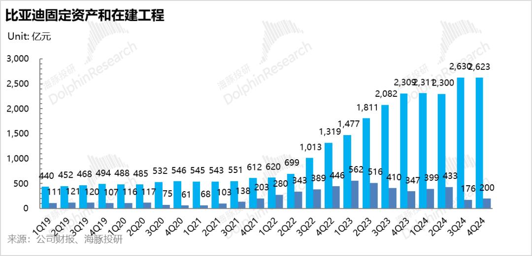 3. 三费仍在大幅增加:这一季度,三项费用仍在持续高增长,尤其是R&D费用,同比增长62亿元,达到近200亿元,达到历史新高!海豚认为,比亚迪第四季度的R&D投资主要用于:① 第四季度,品牌车型相继上市,加强对品牌车型技术的投入;② 准备2025年智驾平权;③ 开发新一代纯电非常E平台,因此相对可以被市场理解。