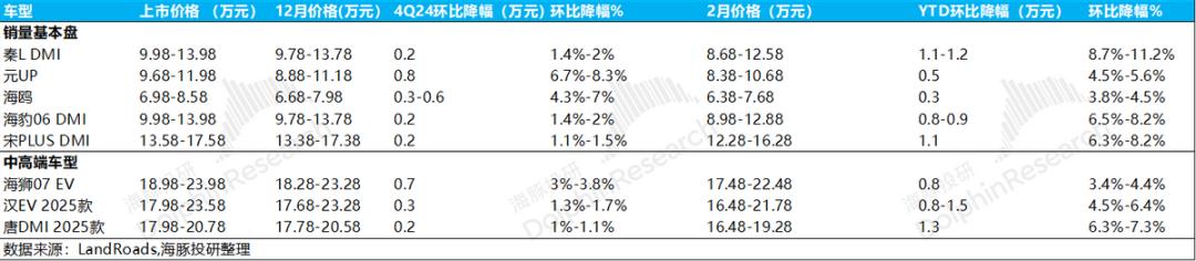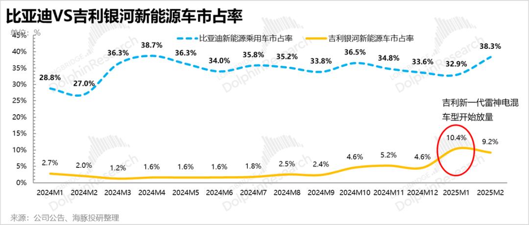 但从月度数据来看,比亚迪10月份市场份额达到峰值后,后续市场份额仍在下降。海豚君认为这种技术主要是因为吉利等同行在2024年下半年开始发布,2024年底开始大规模量产(银河星舰7 EMI),与比亚迪混合成功打造爆款车, 动态技术的代差先发优势已基本被同行追平,此外,比亚迪第四季度对当前车型的降价幅度基本较小,导致2024年12月和2025年1月比亚迪销量低于市场预测。