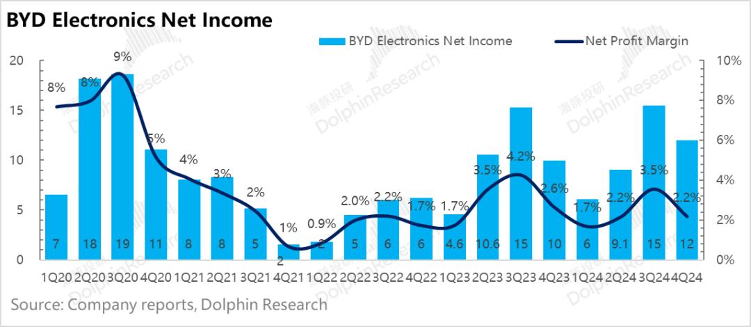 三. 比亚迪的电子业务收入超出预期,但毛利率不如预期。