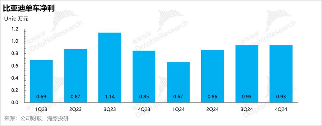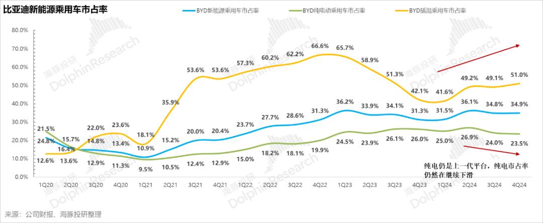 但在纯电方面,由于2024年第四季度比亚迪纯电车型仍使用上一代电动平台,纯电车型竞争力下降,第四季度纯电市场份额呈下降趋势。