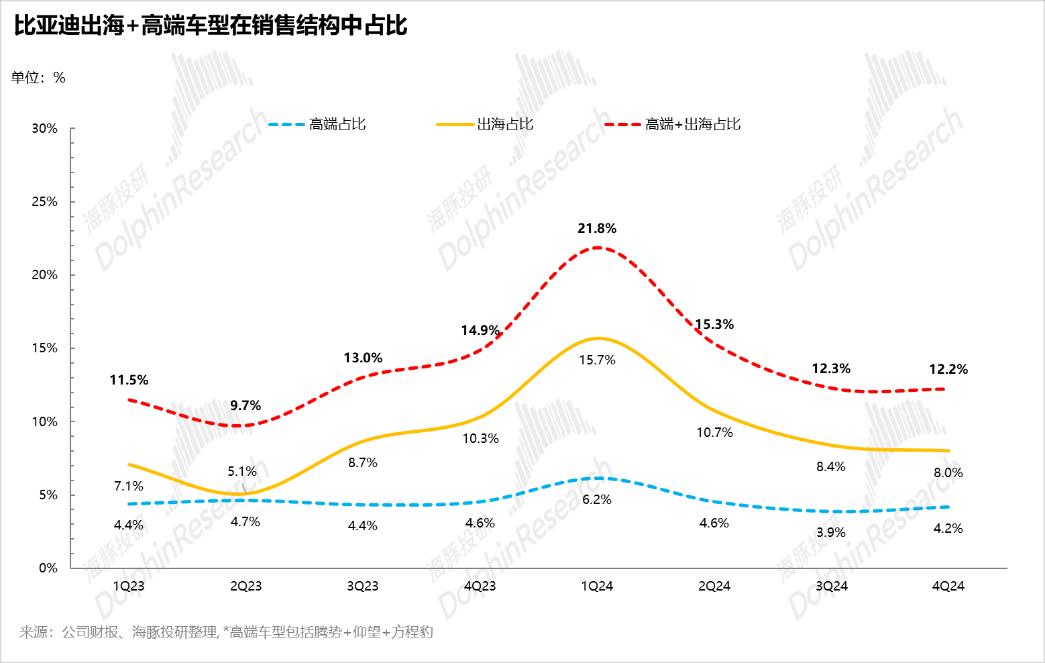 比亚迪提高毛利率的两个方向:品牌化和出海,本季度品牌化的表现依然可以(腾势) 仰望 方程豹的比例环比上升0.3.%),尤其是高档插混,与上季度相比,超过20万的插混增加了1.4。%。