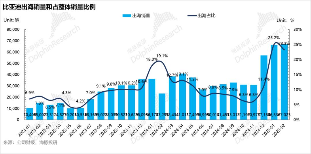 去年12月,比亚迪开始冲锋出口,今年1月至2月国内销售淡季,依然通过出海贡献了较大的增量,使得比亚迪在销售淡季和车型替代期仍能稳定市场份额,主要是因为比亚迪的海外工厂已经开始投产(尤其是去年12月,海外工厂上坡非常快,由原来依靠国内出口到现在已转变为主要来自海外工厂自产)。
