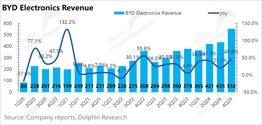 第四季度,以比亚迪电子为主体的手机部件和组装业务实现了551.8亿元的营收,超市预测了507亿元,但毛利率上下降了5.9%。%,与市场预测的8.7%不同,可能是由于消费电子业务对毛利的影响。然而,在比亚迪汽车销量2025年仍能保持确定性的高增长趋势下,比亚迪电子预计仍能得益于汽车电子业务的高增长。